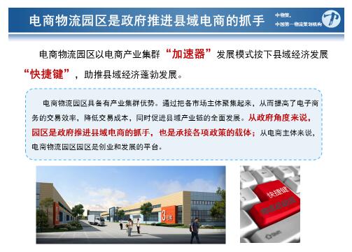 电商强助力,物流大驱动。电子商务物流园区是电商落地的核心举措,是物流产业与电子商务高度融合发展的产物,是重点依托物流产业优化电子商务产业链的专业园区。产业多元化、功能多样化的电子商务物流产业园区将成为产业联动发展的制高点。
