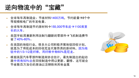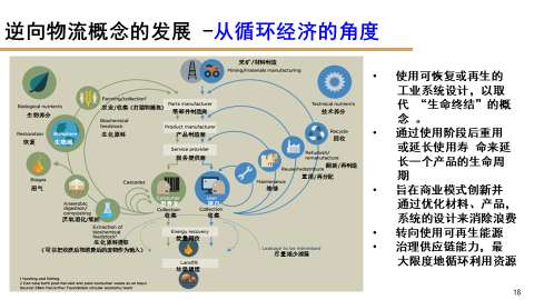 在循环经济体系下,逆向物流如何从源头开始,进行产品的可循环设计。产品不是最后被动收回的,而是生态设计的,即产品设计时就是可拆解、可循环,如果达不到,就再制造、再利用、再资源化,最后最差才变垃圾。所以说,逆向物流是分类产生价值,传统物流核心在“流”上,而逆向物流更侧重“物”。