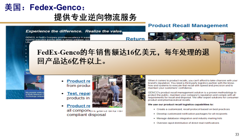 全球领先的逆向物流服务企业Genco的主要业务模式包括退货中心、货给供应商、产品召回、检测维修服务、再循环,年销售额达16亿美元,每年处理的退回产品达6亿件以上,其主要客户都是一些制造型企业。目前,这家企业被FedEx相中,纳入囊中。