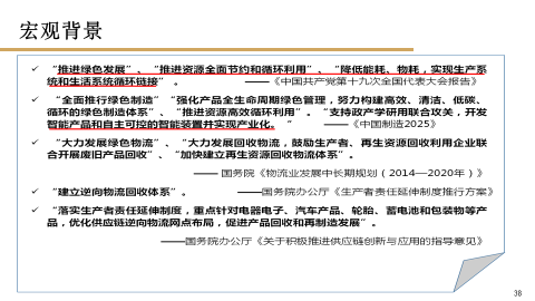 我国的机会是什么?根据跟踪近半年的百度指数,我发现逆向物流和绿色物流、循环经济有很强的相关性。根据环境库兹涅茨曲线,“污染在低收入水平上随人均GDP增加而上升,高收入水平上随GDP增长而下降”。我们为什么要在现在强调生态文明建设,因为我们需要更好的环境。下图可以看到,宏观政策对我们面向循环经济的逆向物流是非常支持的。