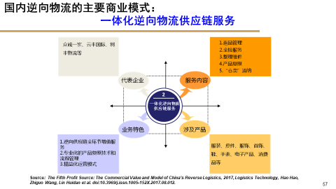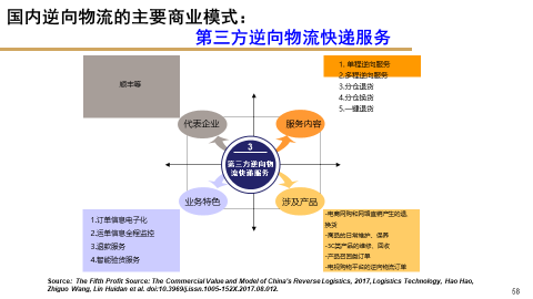 第三种是第三方逆向物流快递,主要是单程的逆向服务、多程逆向服务、分仓退货、分仓换货和一键退货。为什么电商退货越来越快,就是为了让逆向物流成为新的利润源。