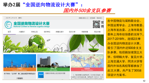 目前,我们团队主持制定了国内首个逆向物流国家标准和3项行业标准,可以说是一路行动,一路践行标准。今年5月成立的全国物流标准化技术委员会逆向物流标准化工作组构架了逆向物流标准体系,将为我国的逆向物流打拼,向世界发出中国人的声音。这是我们两届物流设计大赛,大赛吸引了全球500多个队伍参加,而第三届全国逆向物流设计大赛总决赛将会在明年金秋举办,热烈欢迎国内外各大院校踊跃参加。