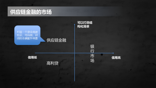 我从事供应链金融很多年,但我不太支持普惠金融,因为难以打造出满足市场需求的产品。从信用度和可以打造度结构化场景两个维度来看,在我国信用度高的业务基本都被银行抢占了,而信用低、难以打造结构化的场景是高利贷,但我们不可能依靠高利贷做普惠金融。而供应链金融是打造一个资金用途特定、可自偿、封闭的金融服务场景,具有很好的发展前景。
