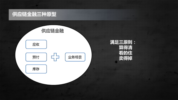 供应链金融有三种原型,即应收、预付、库存+业务场景。供应链金融创新需要满足算得清、看得住和卖得掉三个原则。如果从库存角度来讲,库存资产能不能合理定价,能不能看得住,能不能卖得掉。供应链金融是流动的,流动性越好,金融机构越爱用,但是企业不爱给他用,所以很多时候弄了一批伪资产,以次充好,这是造成金融风险的一个原因。