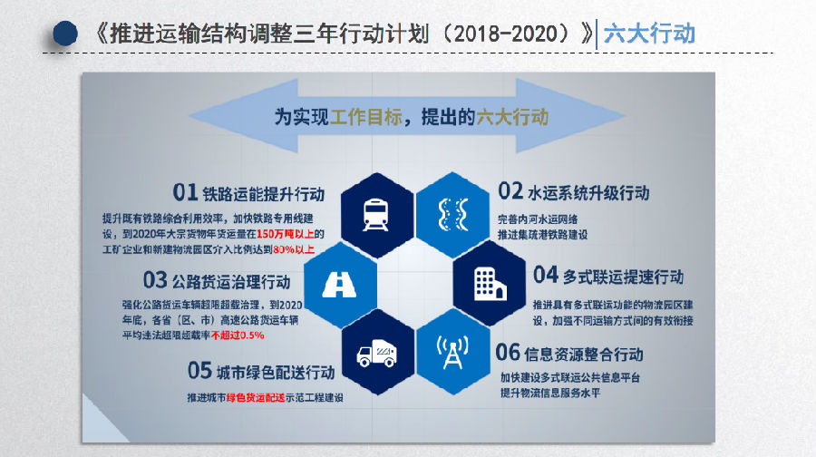 杨教授首先解读了《推进运输结构调整三年行动规划(2018-2020)》的总体目标,以及为实现工作目标所提出的六大行动。