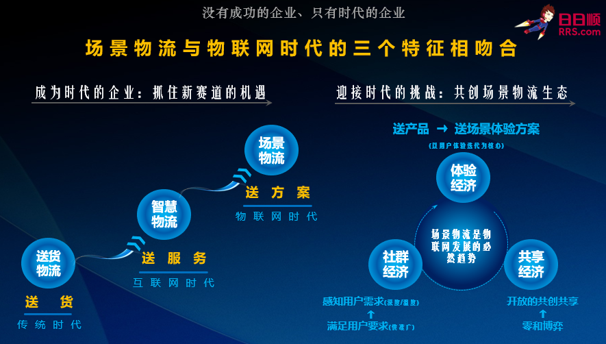 在传统物流时代,物流就是一个简单送货的,实现了物与物之间在不同的物理空间的移动。在互联网时代,日日顺物流以精准、高效、速度为索引的体验物流,在过去的5-6年引领了整个物流时代的发展风向标。进入物联网时代,日日顺物流认为场景物流是接下来要去共建的生态物流体系。为什么是场景生态物流呢?因为它符合物联网时代的三个很强的属性。第一个属性就是体验性,现在的消费者所需要的已不仅仅是送货上楼入户,而是围绕着用户体验迭代去做定制的场景解决方案。这体现出消费者需求在不断的迭代发展,物流人应该围绕这个迭代发展搭建物流服务体系。第二个属性就是社群性,所有的物流企业送货人员,尤其是一线服务人员,不应该是一个简单的搬运工角色,更应该转型成为一个可以感知消费者需求的有温度的触点。也就是通过与消费者之间不断地互动,感知消费者的需求。第三个属性就是共享性,不仅体现在用户端,更重要的是体现在我们与所有合作伙伴的合作上;不仅是物流企业,更应该是物流上下游所有的品牌商、承运商,实现共创共赢。