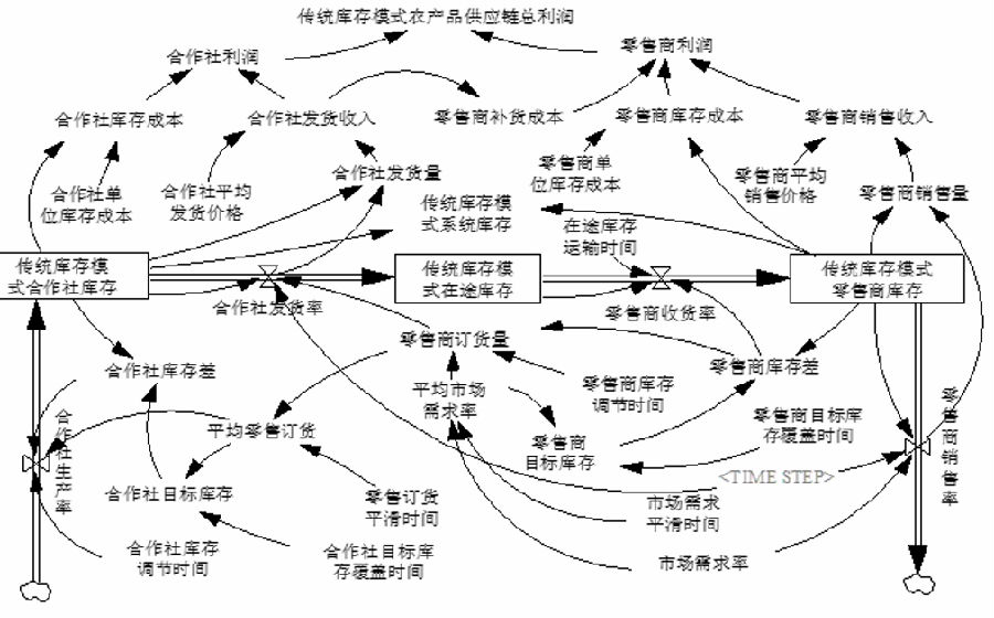 利用系统动力学软件对于传统库存管理模式下农产品供应链流程进行仿真研究,得到的模型如下图所示。