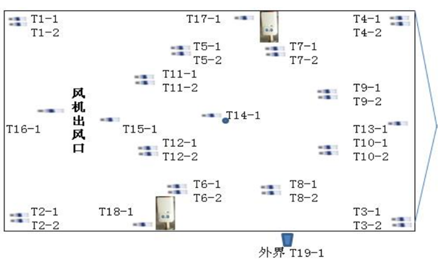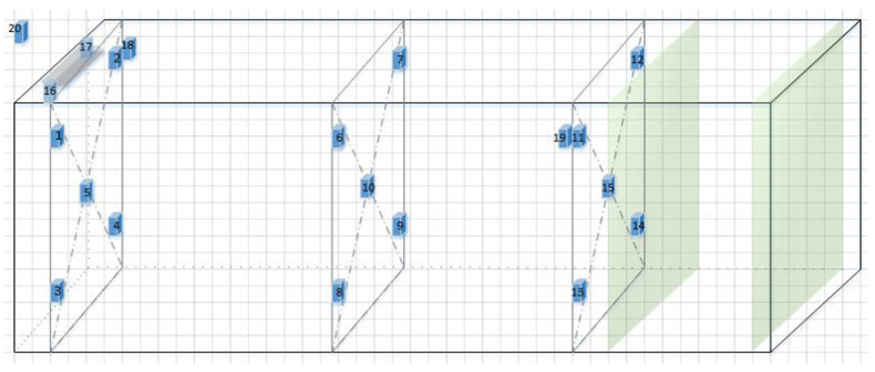 对于车厢内常规监测点,按照车厢容积分3纵面,每个纵面放置5个温度记录仪,上面距出风口下缘10cm,第一纵面离前板10cm,且侧面距车厢壁5cm,下面距车底5cm,第三纵距离车内门帘30cm,共15个。车厢内特殊监测点设置在回风口16号、出风口17号,20号环境温度布点在车门上,两个温度监测探头在18号和19号位置,所有监测点的数量为20个。具体纵面布点验证示意图如下图所示。