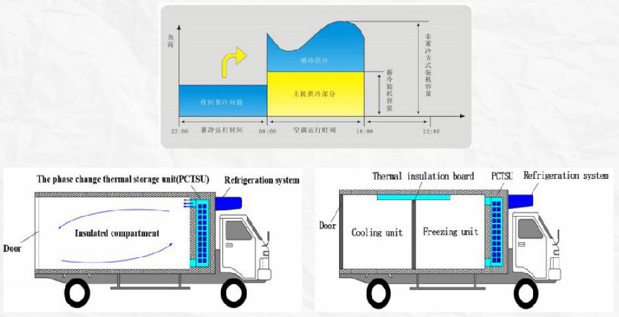 将相变储热装置放置于冷藏车箱体前部,或者在箱体中部添加隔热板,如下图所示。