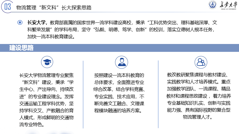 应对变化。新形势新要求下的物流管理专业建设应对变化,应当把握两个途径。一是以不变应万变,坚持夯实专业人才的专业基础,坚持培养具有国际视野的复合型高水平人才。二是主动应变,迎接挑战,依靠特色发展、特色强化综合的理念主动进行专业培养方案调整和优化。