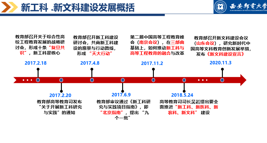 2020年11月3日,教育部新文科建设工作组召开新文科建设工作会议。教育部高等教育司司长吴岩作了题为《积势蓄势谋势识变应变求变全面推进新文科建设》的主旨报告。吴岩司长在报告中指出,要全面把握世界百年未有之大变局的发展大势、科技革命和产业变革的机遇,应对前所未有的严峻挑战,主动引领世界高等教育变革。要把握中国发展的新时代、新成就,把握中国高等教育发展的新需求、新变化、新阶段、新特征、新考验、新变革,通过全面推进“四新”建设,引领本科教育全面振兴。