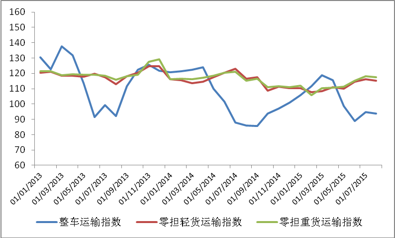 由中国物流与采购联合会和广东林安物流集团联合调查的中国公路物流运价指数2015年8月为102.8点,比上月回落0.9%,比年初下降2.0%,比去年同期回升4.9%。