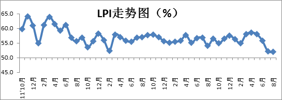 中国物流与采购联合会发布的2015年8月份中国物流业景气指数(LPI)为52%,比上月回落0.2个百分点。各分项指数中,业务总量指数、新订单指数和设备利用率指数较上月回落,其他分项指数较上月有不同程度回升。