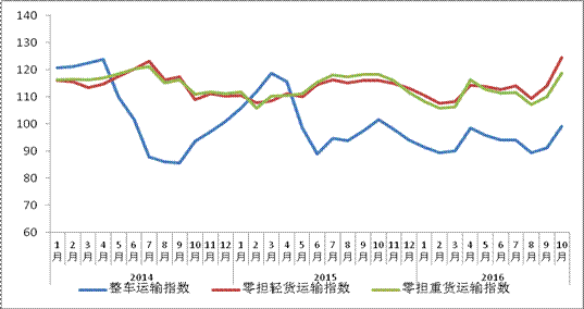 从分车型指数看,各车型指数比上月均较大幅度回升。其中,以大宗商品及区域运输为主的整车指数比上月回升明显,为8.8%,至99.2点。与此同时,电子商务等网上零售消费需求明显趋升,随着“双十一”电商促销活动临近,货主备货需求较为集中,带动零担物流需求较上月显著回升。零担指数中,零担轻货指数为124.6点,比上月回升9.3%,比上年增长7.3%;零担重货指数为118.7点,比上月回升7.9%,比上年同期转为增长0.4%。