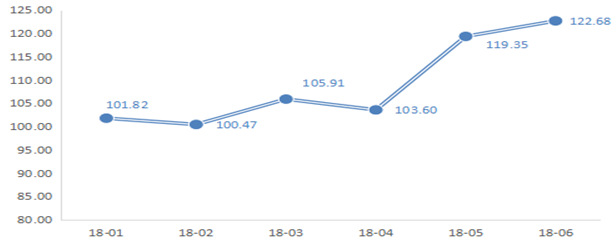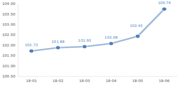 2018年6月,木托盘价格指数收报于103.74点,较1月上涨2.02个百分点,涨幅为1.99%。如图1-1所示,2018年上半年木托盘的价格指数总体呈逐月上升趋势。6月木托盘价格指数为上半年的峰值,且环比上涨幅度相对较大。主要原因是木托盘原材料价格在6月有所上涨,特别是进口木材的价格出现了大幅度上涨,刺激托盘价格不断上涨。2018年上半年的木托盘价格指数均超过100点,且呈稳步上升的态势,这也说明了木托盘产业2018年上半年发展平稳,预计上升的态势会继续保持一段时间。