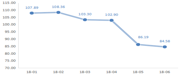 塑料托盘价格上半年整体呈下行趋势。6月塑料托盘价格指数收报于84.58点,较1月下跌23.31个百分点,环比下跌1.6个百分点,跌幅为1.86%。如图4-6所示,2月塑料托盘价格指数出现小幅上调,环比上涨了0.47个百分点,自3月起,塑料托盘的价格指数持续下跌,尤其是5月,环比下跌了16.71个百分点,跌幅为16.24%,跌幅最大。塑料托盘价格持续下跌与国家的环保政策密切相关。先有芜湖市因中央环保督查后违法率仍较高被安徽省环保厅挂牌督查,后有“蓝天保卫战强化督查”将安徽省纳入督查范围,一系列环保政策使塑料托盘的价格一跌再跌,预计下跌的趋势仍会延续。