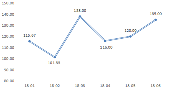 6月托盘行业景气指数收报于135.00点,较1月上涨了19.33个百分点。如图1-5所示,上半年托盘行业景气指数呈现“W”型波动走势,总体呈上升趋势。其中3月达到峰值,收报于138.00点,这主要是因为春节过后企业恢复正常生产经营活动,企业家们对开工后托盘行业的发展信心较足。2018年上半年的托盘行业景气指数均位于荣枯线100以上,除2月(春节期间工厂放假,市场需求量减少,使2月的托盘行业景气指数较低)以外,均在高景气区间波动。