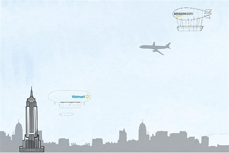 亚马逊与沃尔玛两家零售巨头还提出了激进的“空中仓库”概念。与PriestmanGoode的“水上驳船”概念不同的是,两家公司都试图通过“空中仓库+无人机”的方式,将地面物流服务延伸到空中。