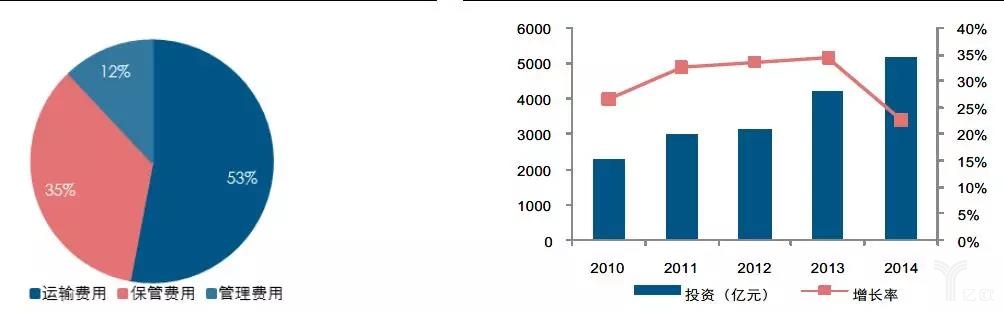 从物流费用的构成来看,2014年尽管交通运输费用占到物流总费用的50%以上,但是与仓储行业相关的保管费用和管理费用比例占到物流总费用的47%,将近一半;从固定资产的投资来看,物流业在仓储行业上的固定资产投资额逐年增加,2014年达到5159亿元,虽然2014年投资增长率有所下降,但是也可以达22.8%,处于较高水平。