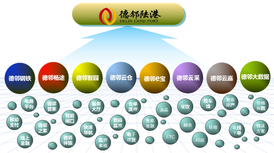德邻陆港平台现有八大服务产品:分别是“德邻畅途”、“德邻智园”、“德邻云仓”、“德邻e宝”、“德邻云采”、“德邻云嘉”、“德邻大数据”及“德邻钢铁”。见图1 。