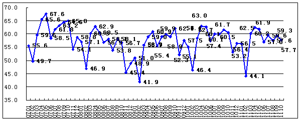 - 2011年10月,中国物流与采购联合会(CFLP)发布的中国非制造业商务活动指数为57.7%,比上月回落1.6个百分点。