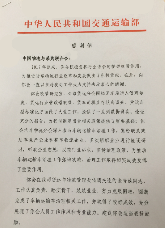 2017年以来,你会积极发挥行业协会的桥梁纽带作用,为推进货运物流行业改革和发展做出了积极贡献,在此,向你会一直以来对我司工作大力支持表示衷心的感谢。