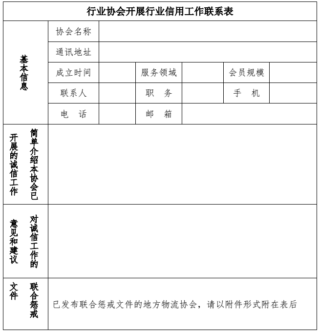 请有意加入行业信用工作的地方物流协会请填写附件《行业协会开展行业信用工作联系表》并提交至中物联(网络事业部)。已提交《物流行业诚信广州倡议书签署备案表》的地方物流协会,直接提交联合惩戒文件即可。