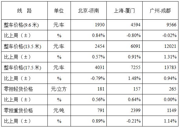 表1 本周部分线路平均价格及环比情况对比