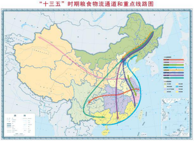 ——“北粮南运”的粮食物流态势更加突出。东北通道粮食年流出量约5000万吨,主要品种是玉米、稻谷(大米),主要流向华东、华南、华北、西南和西北地区;黄淮海通道年流出量约6000万吨,主要品种是小麦,主要流向华东、华南、西南和西北地区;长江中下游通道年流出量约2400万吨,主要品种是稻谷(大米),主要流向华东、华南、西南地区;华东沿海、华南沿海通道年流入量约4900万吨,京津通道年流入量约905万吨,西南通道年流入量约2900万吨,西北通道年流入量约1800万吨。