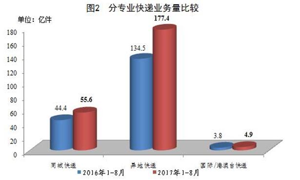 1-8月,同城、异地、国际/港澳台快递业务量分别占全部快递业务量的23.4%、74.5%和2.1%;业务收入分别占全部快递收入的14.6%、50.9%和10.9%。与去年同期相比,同城快递业务量的比重下降0.9个百分点,异地快递业务量的比重上升0.9个百分点,国际/港澳台业务量的比重基本持平。