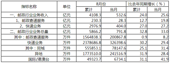 8月份,全行业业务收入完成532.6亿元,同比增长25.6%;业务总量完成791.8亿元,同比增长33%。