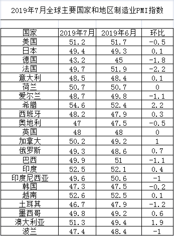 2019年7月全球主要国家制造业指数表