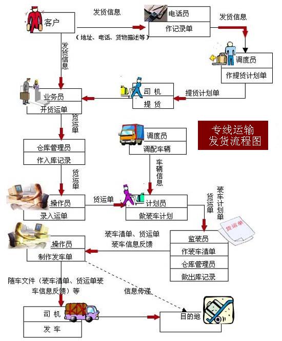 专线运输的业务流程包括预受理(客户电话或者网上发出服务需求)、提货、货运单录入打印、制作发车计划和装车清单发运的流程。专线运输的流程图如附图:专线运输发货流程图。