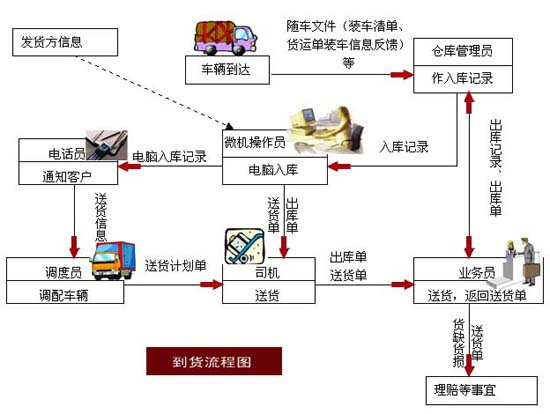转非专线运输基本与发货的代理业务相同,只是先通过公司内部网络进行一部分的运输,到货公司转给其他合作公司完成剩下的运输。这里流程不再分析。到货业务流程参见附图到货流程图。