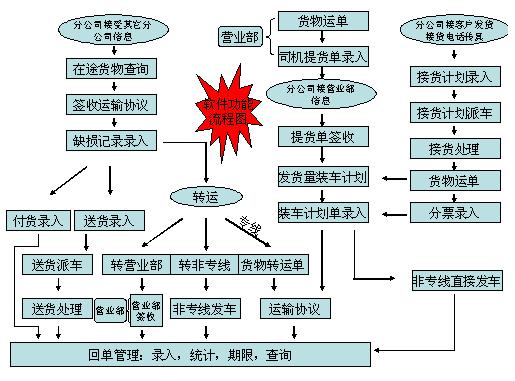 通过对物流企业业务分析,对物流企业子公司和营业部的业务流程分析,我们进行功能流程设计,功能流程图如下: