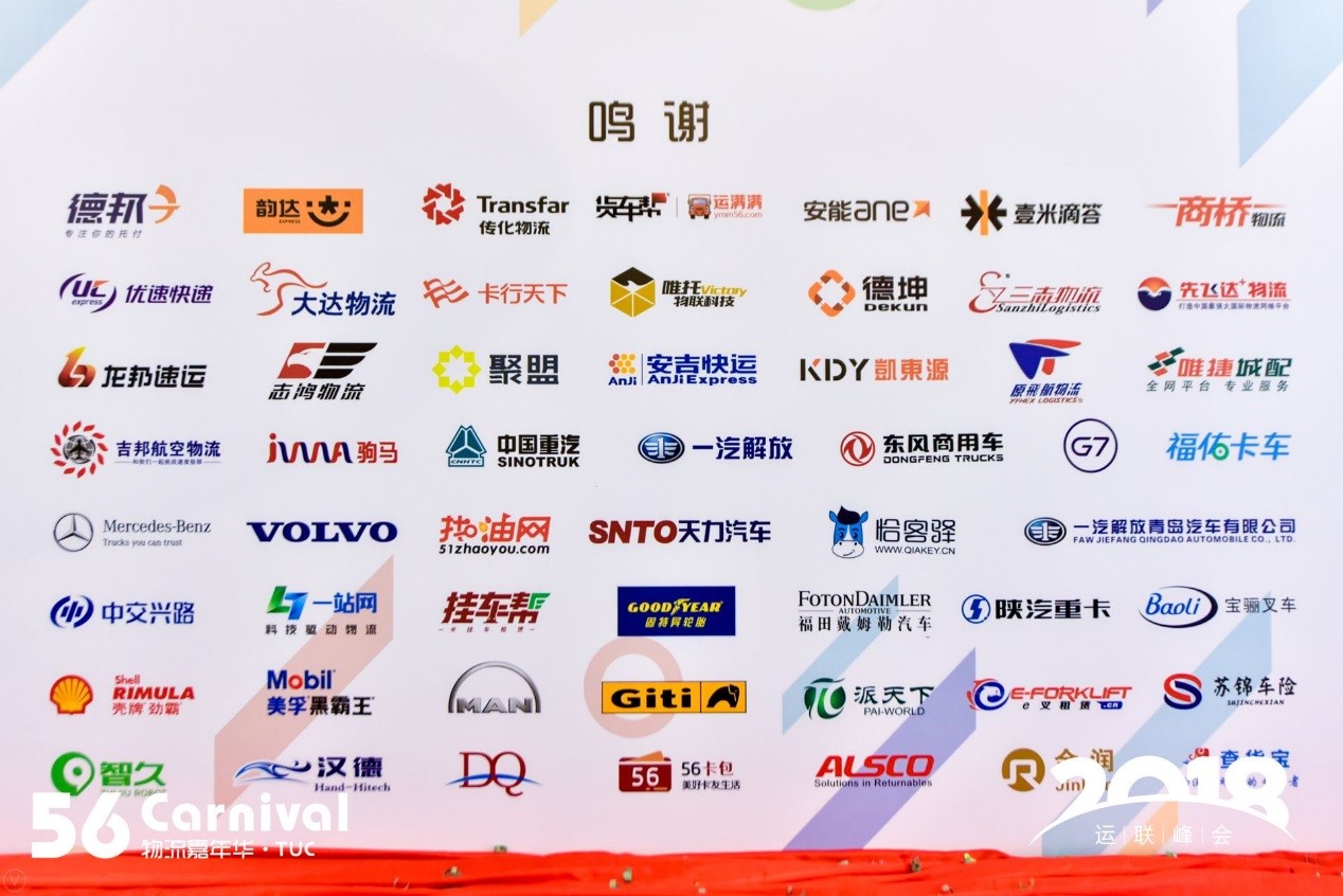 - 2018年5月5日至6日,物流人的狂欢节——56嘉年华在上海汽车会展中心举办,整个物流嘉年华活动分为主会场和分会场,涵盖运联峰会、细分领域论坛、互动竞技活动、展览展示,还包括工装秀大赛、亲子娱乐活动、竞技游戏、最美物流摄影展、叉车比赛和特色展览等丰富物流嘉年华活动。