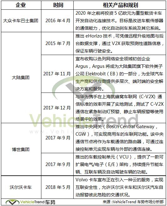 与自动驾驶乘用车不同,目前自动驾驶卡车的主流方案认为该类型的汽车将以编队的形式出现,而非单车自动驾驶。而基于V2V(车-车)的通讯,可实现一些单车多传感器解决不了的问题。因而,在自动驾驶卡车应用场景中,车联网技术至关重要。基于此,部分车企和汽车零部件厂商已经将目光放到车联技术。详见下表: