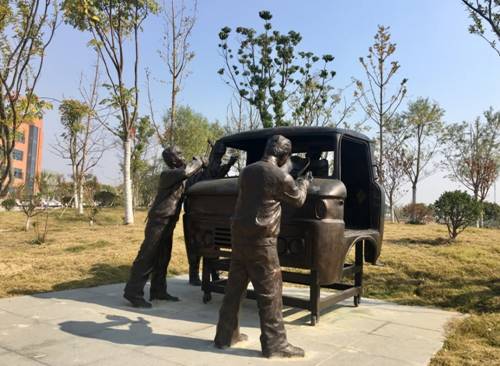 在新港基地摆放着的主题雕塑,再现江淮当年手工敲打驾驶室的历史
