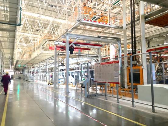 新港基地位于合肥市肥西县桃花工业园新港南区,规划面积3900余亩,其轻卡的整车生产能力、工艺能力、试验验证能力达到全球一流水平,全面实现绿色制造、智能制造。比如,车身冲压新建两条封闭式自动化生产线,冲压机器人12台;焊装车间拥有7条驾驶室拼焊线,其中3条为全自动化焊装线,配置101台机器人,新骏铃宽中体焊装线自动化程度达95%,帅铃焊装线自动化率93%;涂装车间为独立厂房结构,整个工艺流程全自动化;总装线高度整合自动化、柔性化、信息技术,实现多种车型的大规模生产。