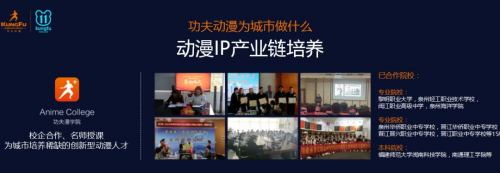 功夫漫学院目前已经和100+所的高校进行合作,并在内建立功夫动漫班,通过课程开发、技能培训,优秀的人才还可以输送到功夫动漫供应链中从业。