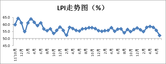 中国物流与采购联合会发布的2015年7月份中国物流业景气指数(LPI)为52.2%,比上月回落3.5个百分点。各分项指数中, 业务总量指数、新订单指数、资金周转率指数、设备利用率指数、主营业务利润指数、主营业务成本指数、固定资产投资完成额指数、从业人员指数和业务活动预期指数回落;库存周转次数指数持平;平均库存量指数和物流服务价格指数回升。