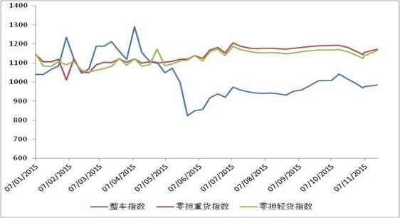 进入11月下旬,公路物流市场需求总体平稳,“双十一”电商促销影响仍在持续,零担公路货运量仍处在较高水平,带动公路物流价格继续小幅上涨。从后期走势看,未来两周公路货运量将逐步趋稳,其中零担指数有望继续小幅回升走势,而整车指数则可能延续震荡走势。