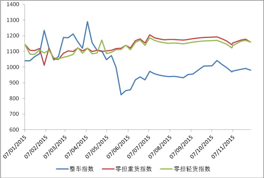 各车型指数环比均有所回落,其中整车指数环比降幅高于零担轻货指数,零担重货指数降幅略高于整车指数。本周,整车指数为980.0点,比上周回落1.1%,比年初回落4.4%;零担轻货指数为1159.6点,比上周回落1.0%,比年初回升4.8%;零担重货指数为1160.0点,比上周回落1.5%,比年初回升4.5%。