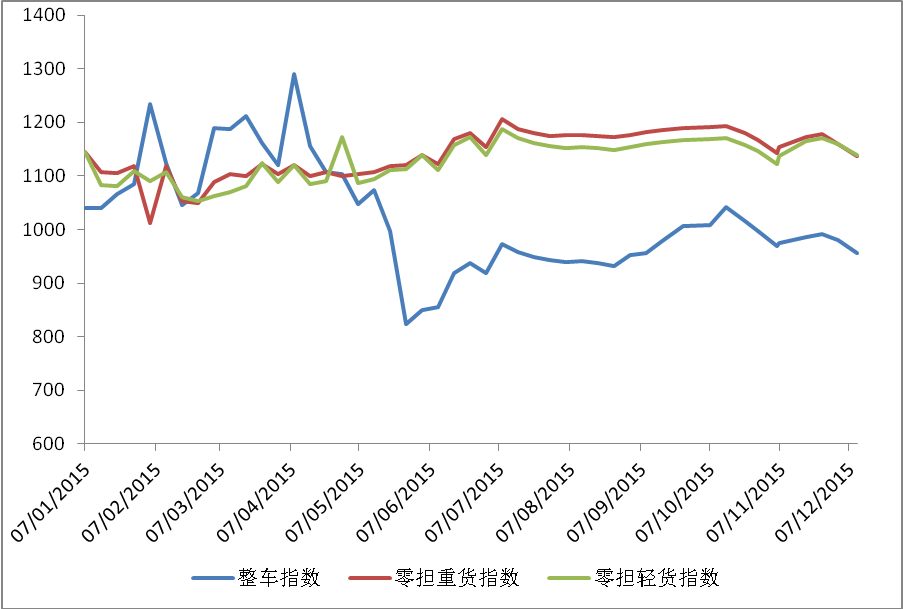 各车型指数环比均有所回落,其中整车指数环比降幅明显高于零担指数,零担重货指数降幅略高于零担轻货指数。本周,整车指数为955.5点,比上周回落2.5%,比年初回落6.8%;零担轻货指数为1138.6点,比上周回落1.8%,比年初回升2.9%;零担重货指数为1137.1点,比上周回落2.0%,比年初回升2.4%。