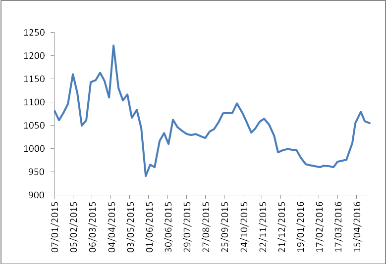 本周(2016年5月2日~5月6日),由中国物流与采购联合会和林安物流集团联合调查的中国公路物流运价指数1054.8点,延续了上周的回落走势,环比上周回落0.4%,比去年同期下降1.1%,但比年初回升5.6%。