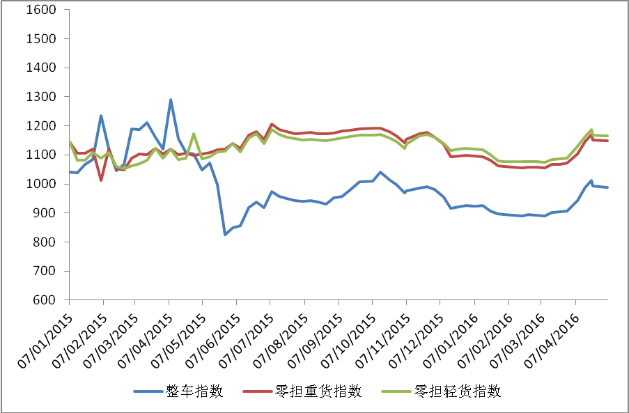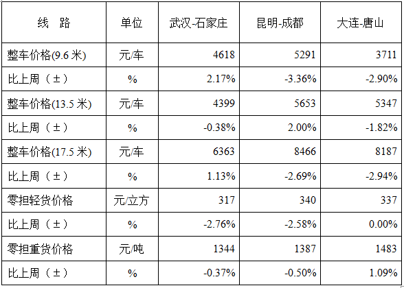 各车型指数环比均有不同程度回落,其中整车指数回落幅度高于零担指数,零担轻货指数回落幅度高于零担重货指数。本周,整车指数为987. 4点,环比回落0.5%,比上年同期下降5.8%,但比年初回升6.7%;零担重货指数为1148.3点,环比回落0.3%,同比回升4.1%;零担轻货指数为1164.4点,环比回落0.4%,同比回升7.2%。