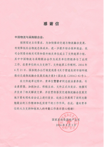 6月21日,国务院办公厅转发了国家发改委《关于营造良好市场环境 推动交通物流融合发展实施方案》(国办发〔2016〕43号)。我会作为文件起草小组成员单位积极参与了此项工作,并在文件正式印发后,开展了解读宣贯工作。为感谢中国物流与采购联合会所做的工作,国家发改委基础产业司于近日致函我会,表示感谢。