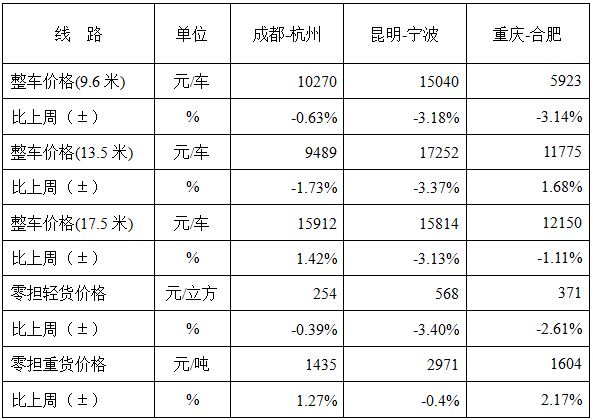 表1 本周部分线路平均价格及环比情况对比