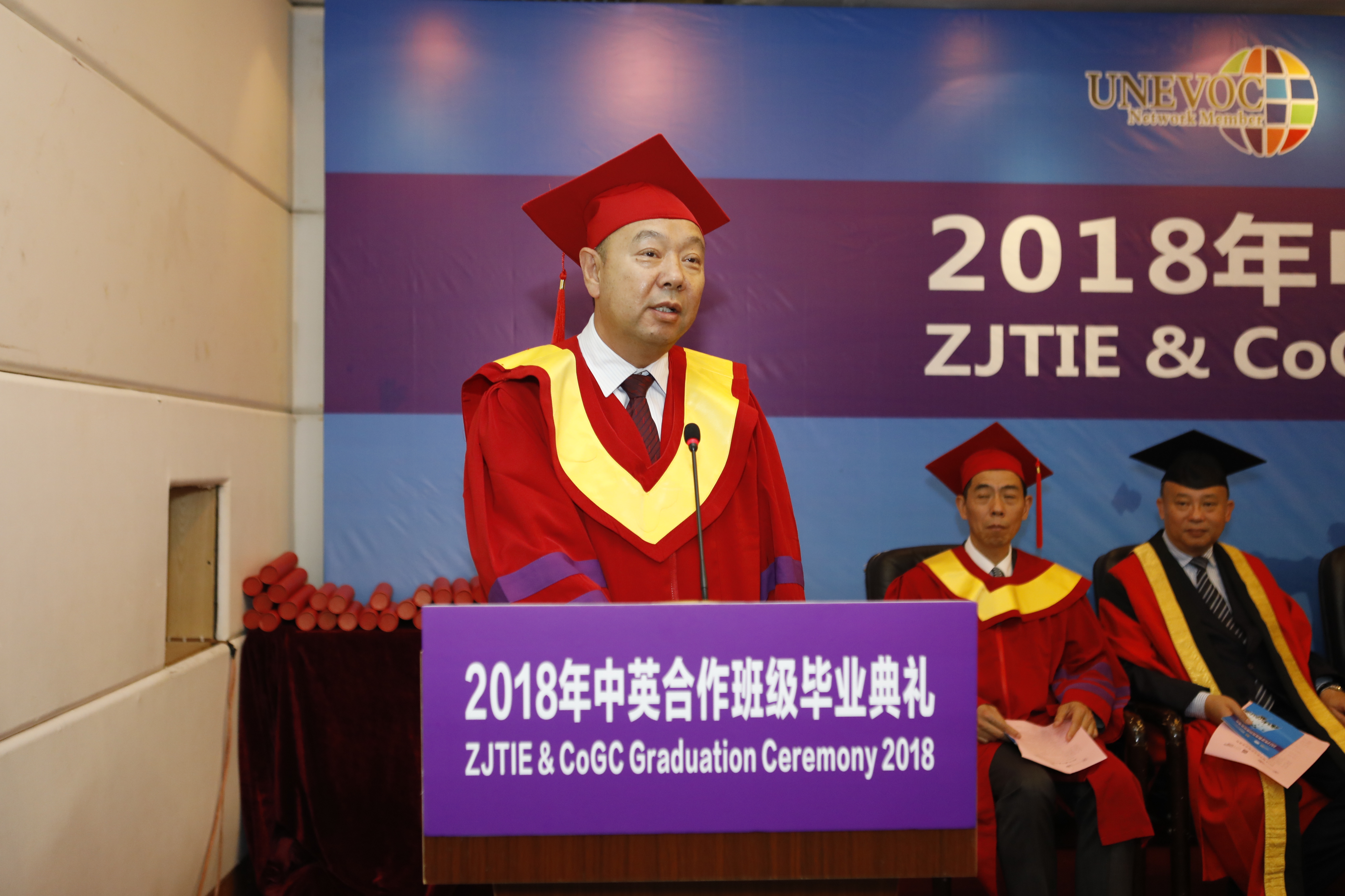 6月12日,中英合作办学项目浙江经济职业技术学院与英国格拉斯哥城市学院物流管理专业首期学生毕业典礼在浙江杭州举办,中国物流与采购联合会副会长、全国物流职业教育教学指导委员会主任任豪祥出席毕业典礼并致辞,浙江经济职业技术学院党委书记俞步松,校长邵庆祥,英国大使馆文化教育处、英国文化教育协会教育文化合作发展主任王海军,英国格拉斯哥城市学院院长Paul Little,英国格拉斯哥城市学院副院长Roy Gardener等领导嘉宾、中英双方教师代表和2018届中英合作班级全体毕业生及家长代表共同参加了闭幕式。