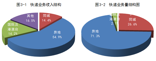 1-8月,同城、异地、国际及港澳台快递业务收入分别占全部快递收入的14.4%、54.9%和14.2%;业务量分别占全部快递业务量的26.6%、71.3%和2.1%。与去年同期相比,同城快递业务收入的比重上升1.8个百分点,异地快递业务收入的比重下降0.4个百分点,国际及港澳台业务收入的比重下降了1.9个百分点。